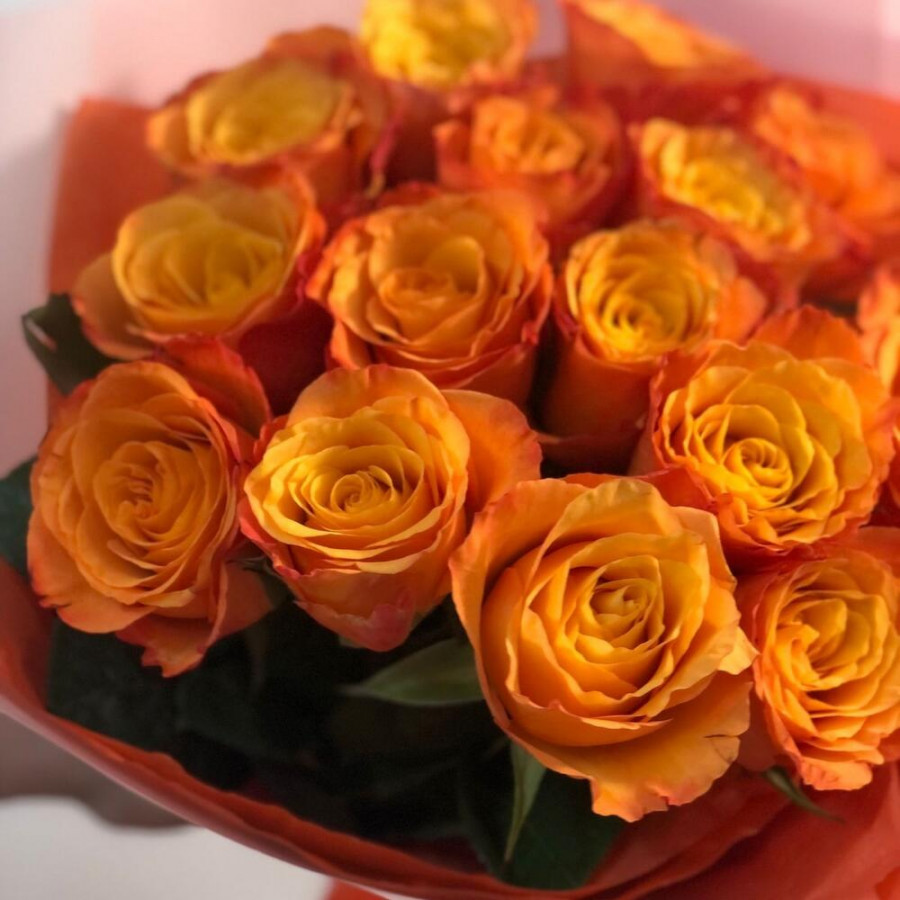 На фото 15 оранжевых роз. В составе: роза 15 шт, дизайнерская упаковка 2 шт, атласная лента 2 шт, . Все цветы свежие и ароматные, букет красиво оформлен и отлично подходит для подарка. Доступна доставка цветов или самовывоз.